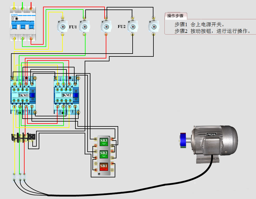 电机要实现正反转控制:将其电源的相序中任意两相对调即可(简称换相),通常是V相不变,将U相及W相对调,为了保证两个接触器动作时能够可靠调换电动机的相序,接线时应使接触器的上口接线保持一致,在接触器的下口调相。。由于将两相相序对调,故须确保2个KM线圈不能同时得电,否则会发生严重的相间短路故障,因此必须采取联锁。为安全起见,常采用按钮联锁(机械)和接触器联锁(电气)的双重联锁正反转控制线路(如原理图所示);使用了(机械)按钮联锁,即使同时按下正反转按钮,调相用的两接触器也不可能同时得电,机械上避免了相间短路。另外,由于应用的(电气)接触器间的联锁,所以只要其中一个接触器得电,其长闭触点(串接在对方线圈的控制线路中)就不会闭合,这样在机械、电气双重联锁的应用下,电机的供电系统不可能相间短路,有效地保护的电机,同时也避免在调相时相间短路造成事故,烧坏接触器。