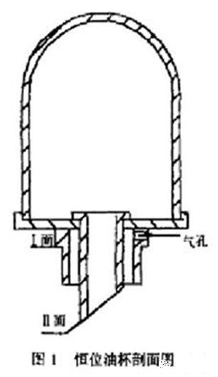 图1,上部为玻璃罩,可以观察油杯内油位高度。其他为金属部分,其上有如图所示的气孔和楔面Ⅱ,在油杯的结构中具有重要作用。
